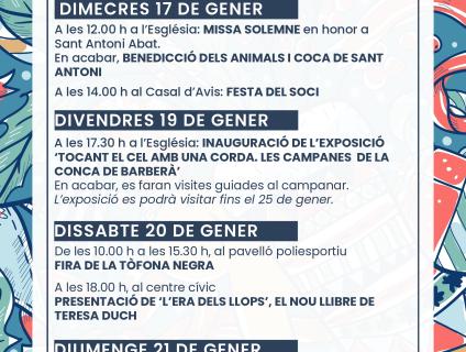 A les 12.00h a l'Església: Missa Solemne en honor a Sant Antoni Abat. En acabar, benedicció dels animals i coca de Sant Antoni. A les 14.00h al Casal d'Avis: Festa del soci.
