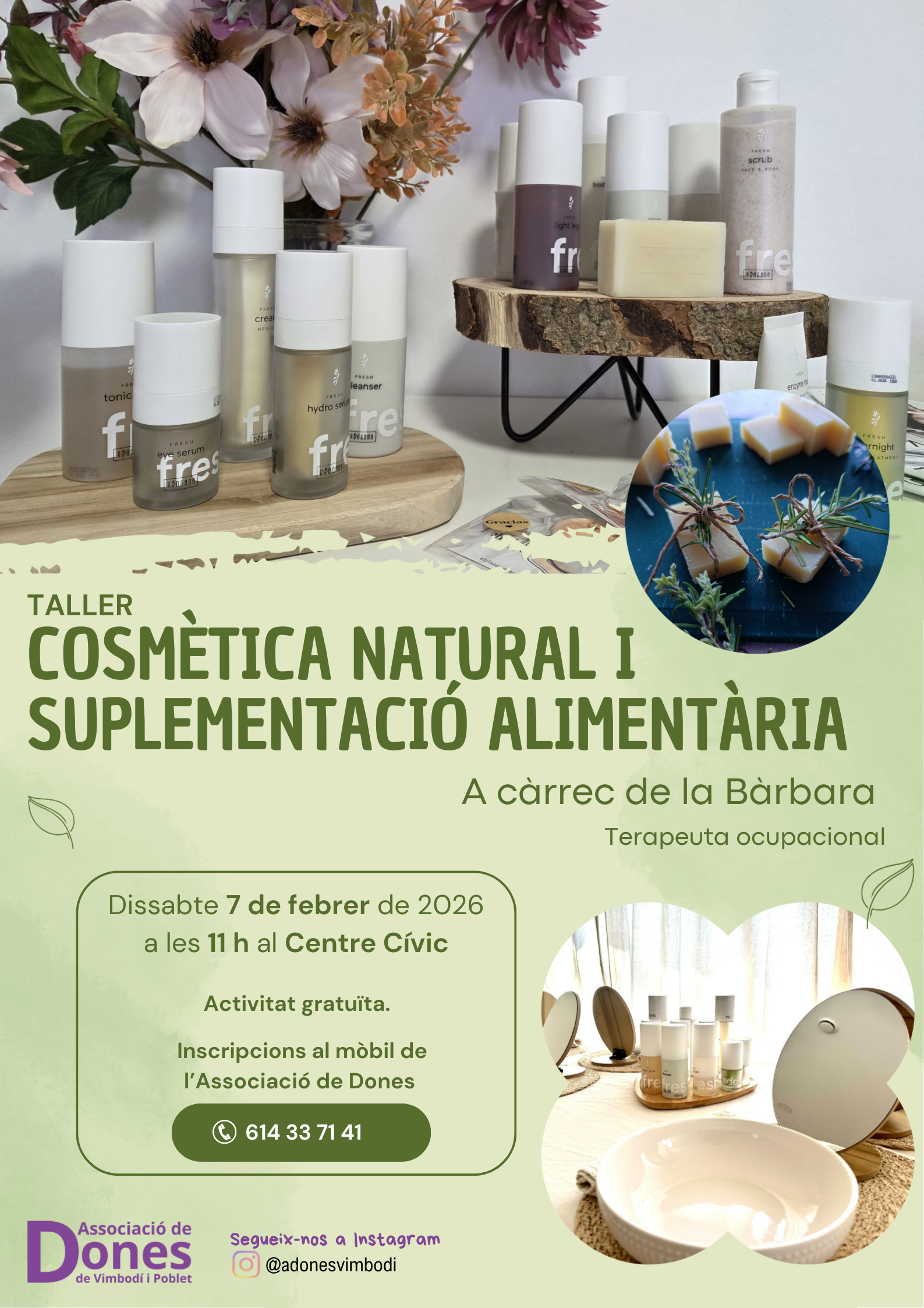 L’Associació de Dones de Vimbodí i Poblet organitza el taller “Cosmètica natural i suplementació alimentària”, a càrrec de la Bàrbara, terapeuta ocupacional.