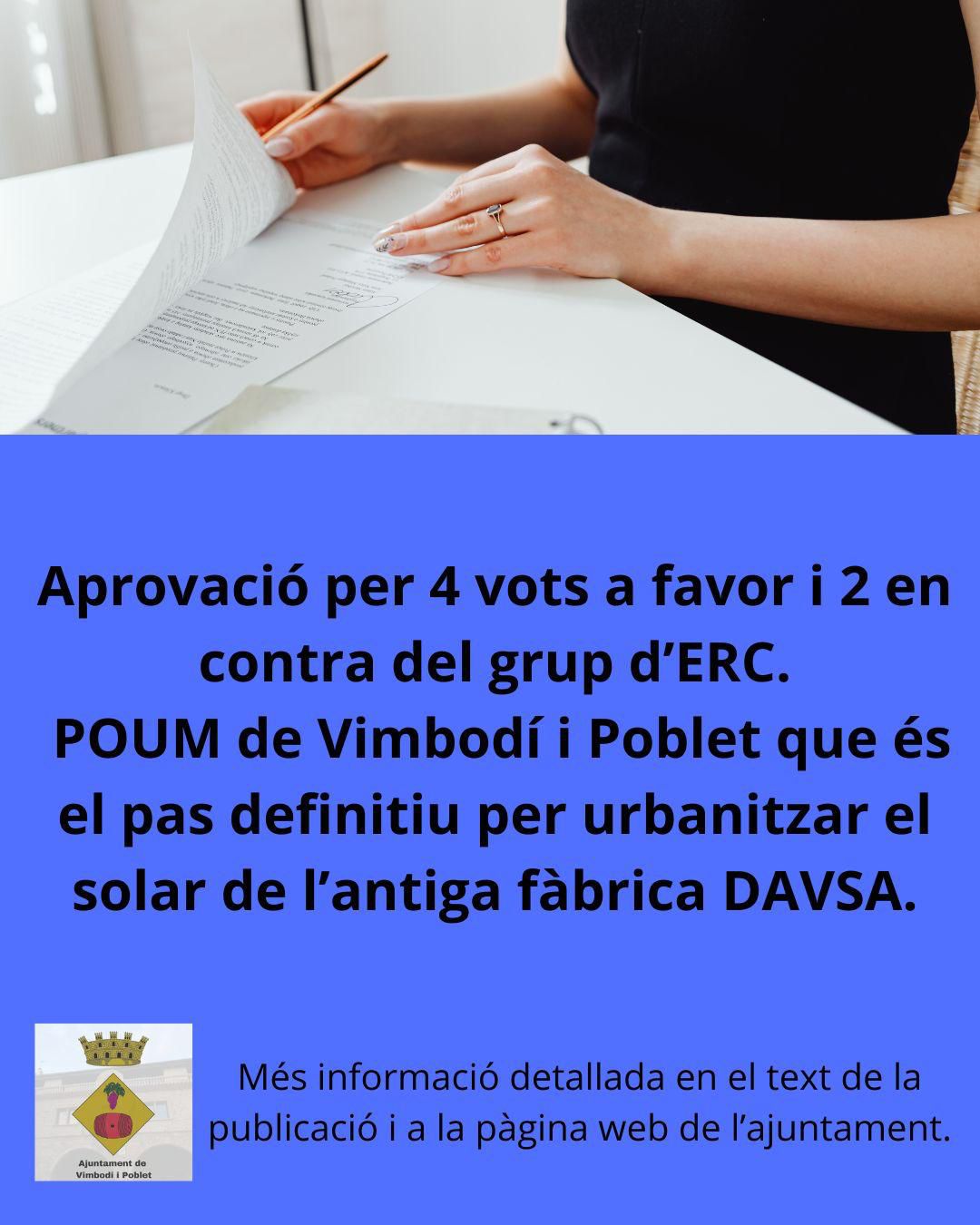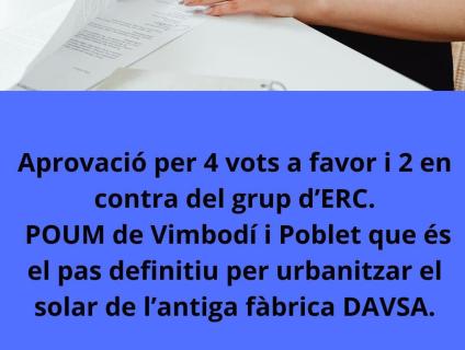 Finalment, el ple va aprovar, també amb 4 vots a favor i 2 en contra, el POUM de Vimbodí i Poblet, un pas definitiu que permetrà avançar en la urbanització del solar de l’antiga fàbrica DAVSA.
