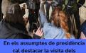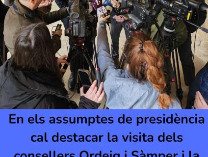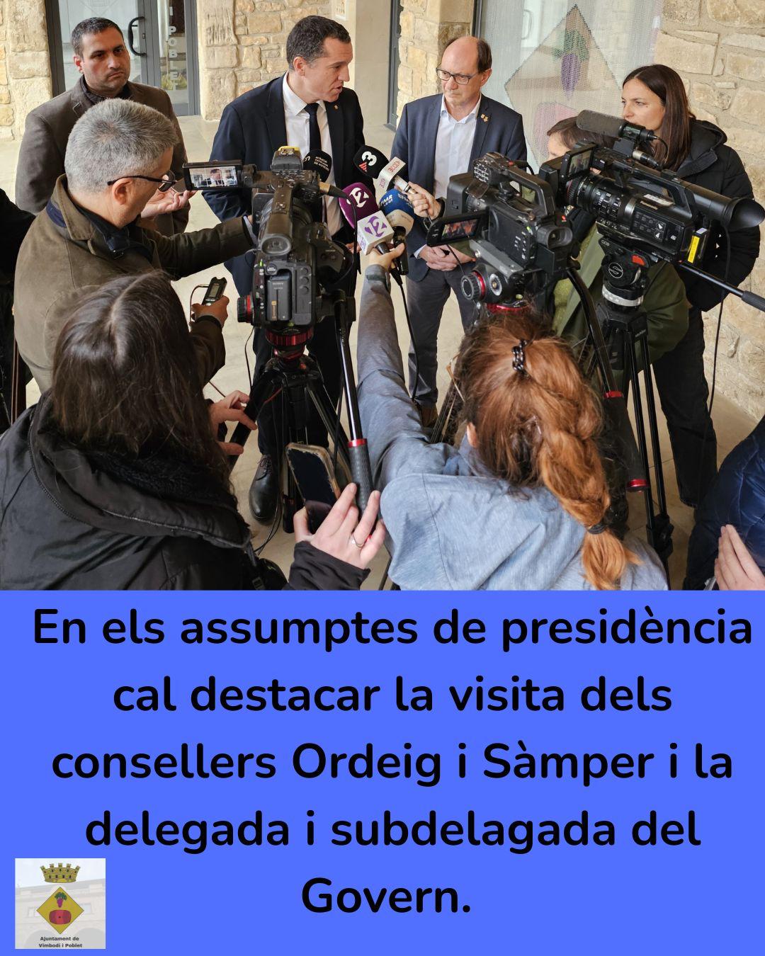 En l’apartat de presidència, cal destacar les visites institucionals dels consellers Òscar Ordeig, titular d’Agricultura, i Miquel Sàmper, conseller d’Empresa. Així mateix, el consistori va rebre la visita de la delegada del Govern espanyol, Lucía López, i de la subdelegada, Elisabet Romero.