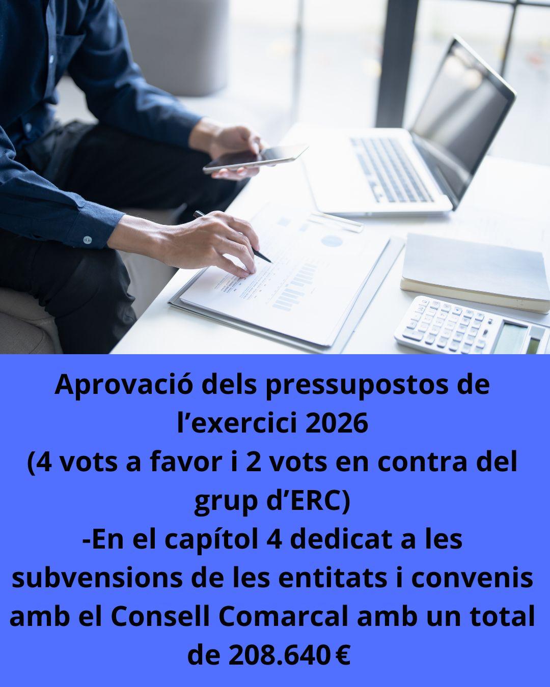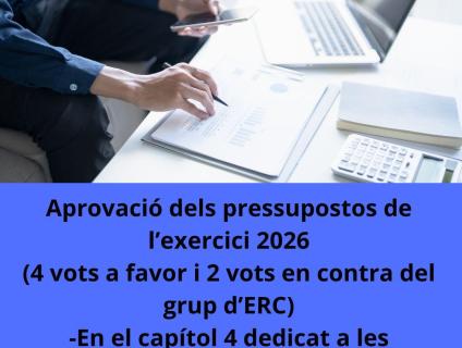 Pel que fa a l’activitat plenària, un dels punts més destacats va ser l’aprovació del pressupost municipal per a l’exercici 2026, que va tirar endavant amb 4 vots a favor i 2 en contra del grup de l’oposició (ERC).